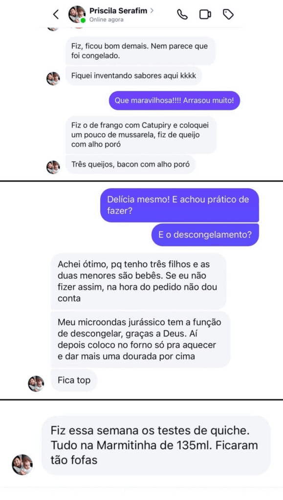 Com a rotina corrida de mãe de três filhos, a Priscilla precisava de uma forma eficiente de produzir e vender seus quiches sem perder qualidade e sem passar horas na cozinha todos os dias.