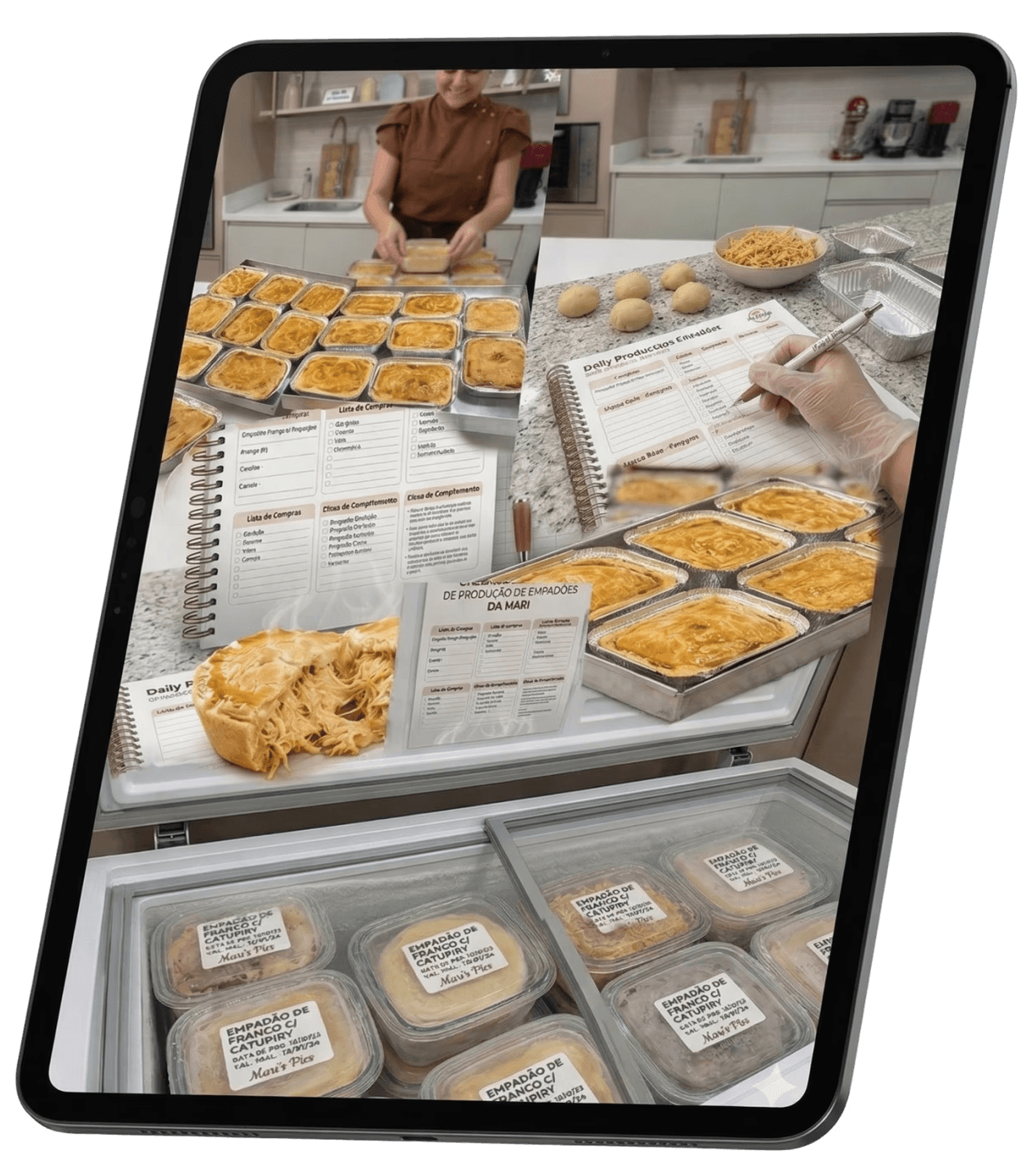 Acesso imediato aos vídeos diretos ao ponto mostrando a massa perfeita, recheios e o segredo do congelamento.